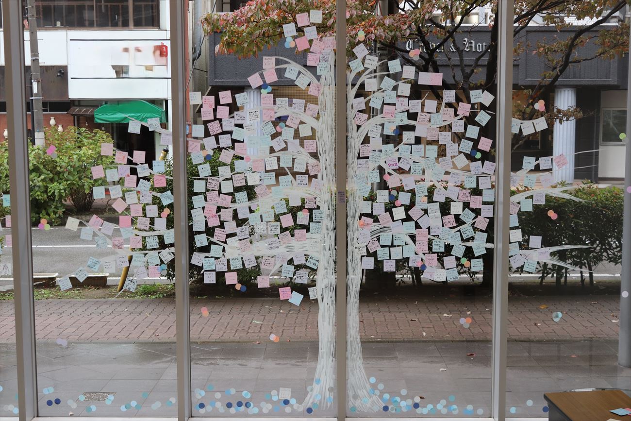Nタワー1階ガラス面に描かれた大きな木をキャンバスに、学生一人ひとりが「N★FESへの意気込み」や「仲間へのメッセージ」を付箋に書き、1か月前より少しずつ貼り重ねてきました。枝葉のように広がる言葉の数々が、学生たちの成長と想いを映し出しています。当日はご来場の皆さまにもご参加いただけます。