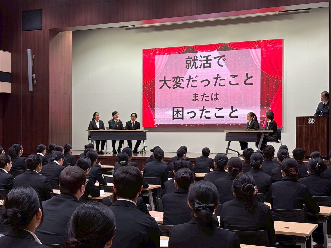 当日は、日本企業への就職が決定している2年生が登壇し、就職活動の進め方や選考で意識したポイント、面接対策などについて、自身の経験をもとにアドバイスを行いました。これから就職活動を本格化させる1年生は、実体験に基づく話に真剣な表情で耳を傾けていました。